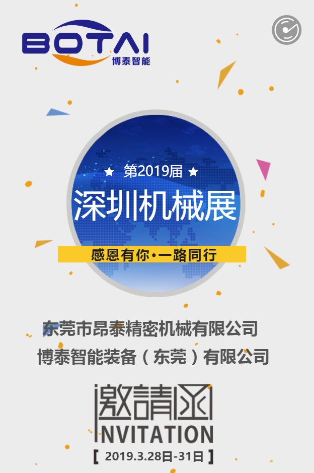 第20届深圳国际机械制造工业展览会 地址:中国.深圳会展中心 展位:8号馆 8C49 现诚邀阁下于2019年3月28日至31日莅临我司展台 参观感谢您的支持 mile米乐智能装备(东莞)有限公司